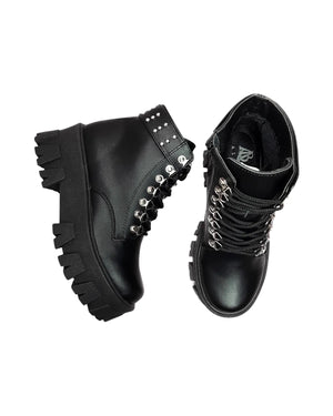Los botines Lupe destacan por su diseño moderno con taches, brindando un toque de rebeldía a tu look. Su plataforma y suela plana garantizan estabilidad y confort durante todo el día.